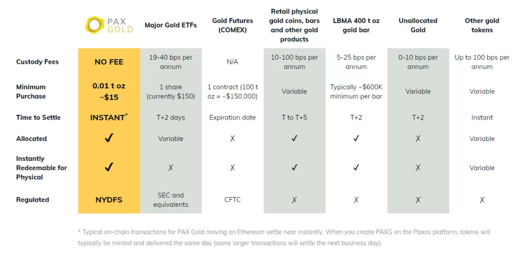 ข้อดีของ PAXG (อาจรวมถึง Cryptocurrency สกุลอื่นที่รองรับด้วยทองคำ) เมื่อเทียบกับการซื้อขายทองคำทั่วไปคือเราไม่จำเป็นต้องจ่ายค่าธรรมเนียมในการดูแลรักษาทองคำการซื้อโดยตรงจาก Paxos นั้นจะเสียค่าธรรมเนียมอยู่ที่ 0.3-1% การซื้อขายโดยตรงหลังจากนั้นจะเกิดขึ้นบน Ethereum Blockchain ที่มีค่าธรรมเนียมต่ำมาก การซื้อขายบน Exchange ซึ่งค่อนข้างถูก (0.15-0.25%) เมื่อเทียบกับการซื้อขายทองคำผ่าน Broker ทั่วไป รวมถึงเราสามารถ audit ทองคำได้ผ่าน Ethereum Blockchain ตาม Address ผ่านหน้าเว็ปไซต์ นอกจากนี้การถูกรับรองด้วย NYDFS นั้นก็เป็นความปลอดภัยในการถือทองรูปแบบดิจิทัลที่ดีที่สุดเท่าที่จะหาได้แล้ว และเนื่องจากตลาด Cryptocurrency นั้นเป็นรูปแบบ Global ทำให้ปัญหา Liquidity ไม่ถูกปิดกันในประเทศ ในตอนช่วงที่เกิดวิกฤต Covid-19 เราจะเห็นว่าแม้ราคาทองคำในประเทศไทยจะปรับตัวตามตลาดโลก แต่เมื่อมีผู้ขายมากกว่าผู้ซื้อร้านทองบางร้านก็ไม่มีเงินสดมากเพียงพอที่จะรับซื้อ