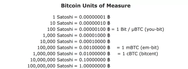 1 หน่วยของ Bitcoin จะถูกเรียกว่า 1 BTC และมีค่าเท่ากับ 10 ล้านซาโตชิ ด้วยความที่ Bitcoin เป็นเงินดิจิทัลทำให้มันสะดวกในการใช้งานถ้าเทียบกับเงินจริง หากเราซื้อของราคา 0.5 BTC เราก็ไม่จำเป็นต้องรอเงินทอนเสมือนเงินจริง และการใช้งาน Bitcoin นั้นเราก็ไม่จำเป็นที่จะต้องใช้ถึง 1 หน่วย Bitcoin เพราะมันสามารถแยกย่อยได้อีก 8 หลักนั้นเอง