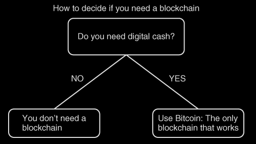 สำหรับบุคคลที่สามที่ทำหน้าที่ให้บริการการชำระเงิน การซื้อขายแลกเปลี่ยน และการจดบันทึกบัญชีทั่วไปแล้ว บล็อกเชนนั้นเป็นเทคโนโลยีที่มีต้นทุนสูงและไม่มีประสิทธิภาพในการใช้งานเอาเสียเลย บล็อกเชนที่ไม่ใช่บิตคอยน์นั้นได้รวมเอาสิ่งที่แย่ที่สุดของทั้งสองโลกเข้ามาไว้ด้วยกันนั่นคือ: โครงสร้างที่อืดอาดอุ้ยอ้ายของบล็อกเชนกับต้นทุนและความเสี่ยงทางด้านความปลอดภัยของการมีตัวกลางที่อาศัยความเชื่อถือ มันจึงไม่ใช่เรื่องน่าแปลกใจที่เหตุแม้ว่าเวลาจะผ่านมาถึงแปดปีแล้วก็ตาม ใดเทคโนโลยบล็อกเชนจึงยังไม่สามารถให้กำเนิดรูปแบบการใช้งานที่ประสบความสำเร็จและพร้อมต่อการใช้งานเชิงพาณิชย์นอกเหนือไปจากสิ่งเดียวที่มันถูกออกแบบมาโดยเฉพาะนั่นก็คือ: บิตคอยน์