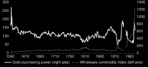 กำลังซื้อของทองคำต่อสินค้าโภคภัณฑ์ในประเทศอังกฤษในช่วง 1560-1976