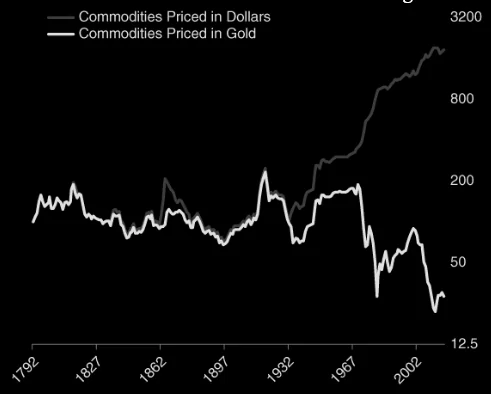 รูปที่ 9 ราคาของสินค้าโภคภัณฑ์เมื่อเทียบกับทองคำและดอลลาร์ในช่วง 1792-2016