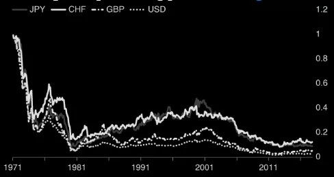 รูปที่ 10 สกุลเงินต่างๆเมื่อเทียบกับมูลค่ากับทองคำในปี 1971-2017
