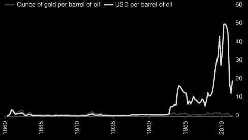 รูป 1-1 ราคาของน้ำมันเมื่อเทียบกับดอลลาร์และออนซ์ทองคำในช่วงปี 1816-2017 ในราคาต่างๆตั้งแต่ปี 1971