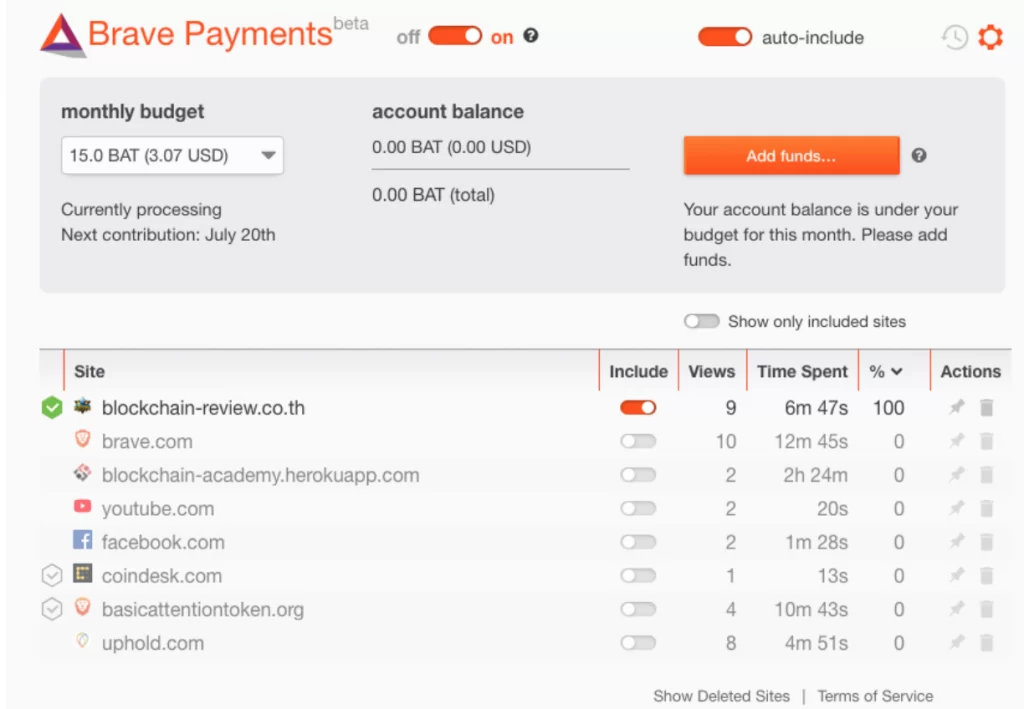 การ Donation จะเป็นลักษณะการจ่ายเงินรายเดือนซึ่งผู้ใช้งานสามารถเลือกได้ว่าจะบริจาคให้ Websiteไหนโดยสามารถกดเลือกที่แถบ Include โดยผู้รับที่เป็น Verify Publisher สังเกตุได้จากเครื่องหมายถูกต้องสีเขียว และเราจะเลือกได้ว่าจะบริจาคในสัดส่วนเท่าไหร่ ในตอนนี้สำหรับใครที่ดาวน์โหลด Brave มาใช้นั้นสามารถรับ 15 BAT มาใช้ได้ฟรีในครั้งแรก