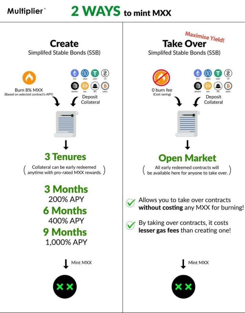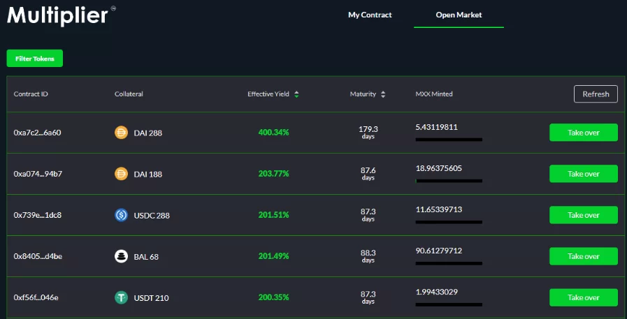 เดิมทีการจะได้ MXX นั้นเราจะต้องทำการฝากหรือกู้ใน Mxx แต่ใน Defi Beta นี้เราจะได้ Mxx จากการเปิด Contract โดยเราต้องเอาเหรียญต่างๆไปสร้างสัญญาเช่น USDT USDC DAI ETH YFI BAL โดยเหรียญนั้นจะถูกล็อคเวลาหนึ่งโดยเราจะได้ผลตอบแทนที่สูงถึง 200-1000% ในรูปแบบ Mxx ดังนี้