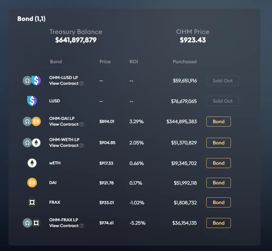 โดยปกติแล้วหากราคา OHM มีค่าเท่ากับราคาสินทรัพย์ที่ค้ำอยู่ก็คงจะไม่มีใครเห็นค่าของมัน OlympusDao จึงคิดค้นวิธีการขาย OHM ที่เรียกว่าว่า Bond (1,1) โดยหลักการก็คือ