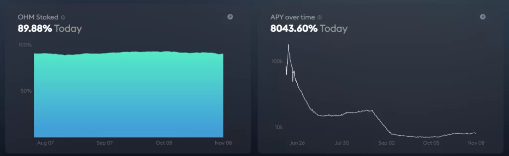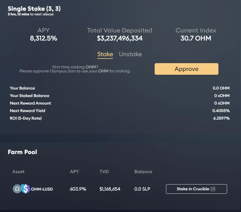 จากตัวอย่างปัจจุบัน การ Stake OHM ได้ผลตอบแทนที่สูงถึง 8,312.5% APY สาเหตุที่มันได้เยอะแบบนี้มาจากกลไกการรักษาราคา OHM ครับ