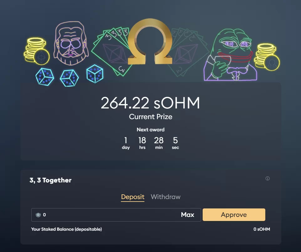 นอกจากนี้การ Stake OHM จะได้ sOHM มาเป็นสัญญาในการฝาก รายได้จากการขาย Bond จะมาทบต้นใน sOHM Pool ทำให้ sOHM เป็นแหล่งเก็บสะสมมูลค่าที่โตขึ้นเรื่อยๆ เราสามารถฝาก sOHMไว้ใน 3,3 Together จาก Pool Together ซึ่งเป็น Partnership กับ OlympusDAO โดยถ้าเราฝาก sOHM ไว้ที่นี่จะมีโอกาสได้รับรางวัลพิเศษ ยิ่งฝากมากก็ยิ่งมีโอกาสได้มาก ลักษณะคล้ายกับสลากออมสินของธนาคารออมสินครับ และเมื่อเราต้องการ Unstake การแลก sOHM กลับเป็น OHM จะทำให้ได้ OHM มากกว่าเดิม เพราะมี OHM เสริมจากรายได้ขาย Bond