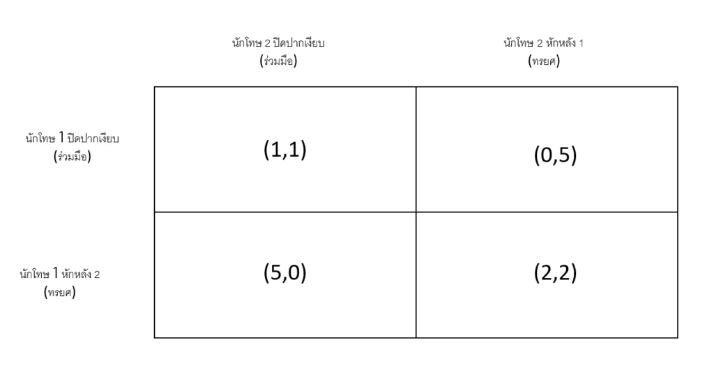 - ถ้าทั้งสองคิดทรยศเหมือนกันก็จะได้รับโทษคนละ 2 ปี