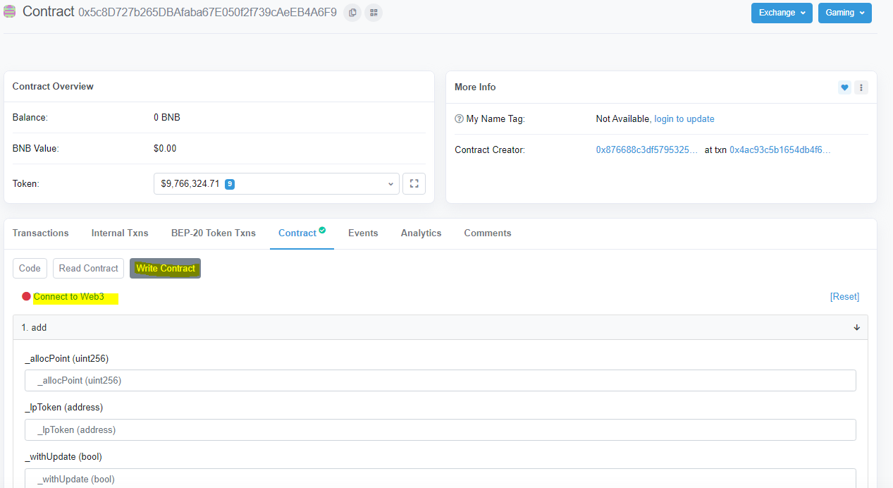 ตัวอย่างเช่น Contract ของ PancakeSwap ให้เราดูที่ Contract Owner ให้เราคลิกเข้าไป