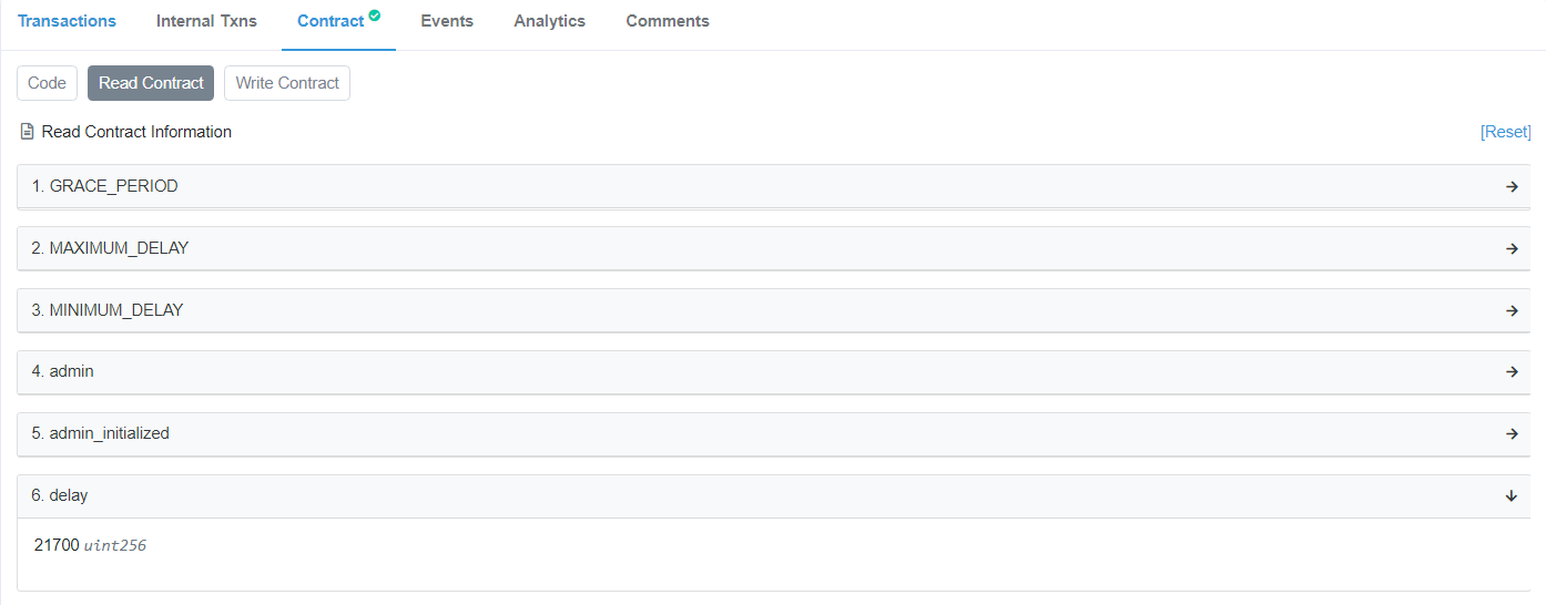 เราจะพบกับ Contract ชื่อ Timelock ให้เราหาฟังชั่น Delay ว่ามีค่าเท่าใดแล้วหารด้วย 3600 จะได้เท่ากับชั่วโมงของ Timelock