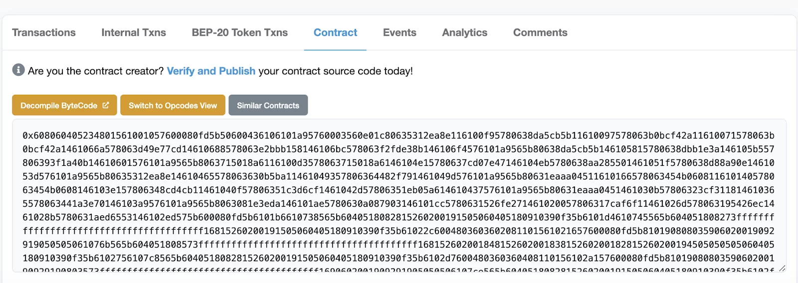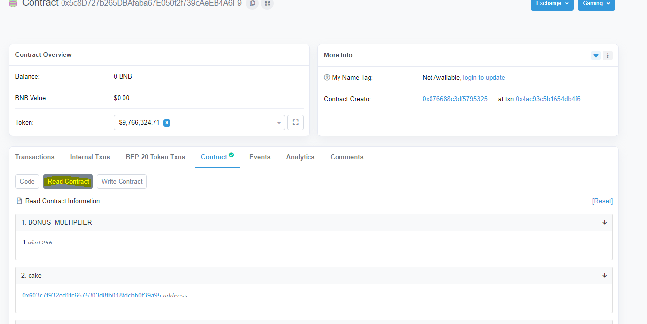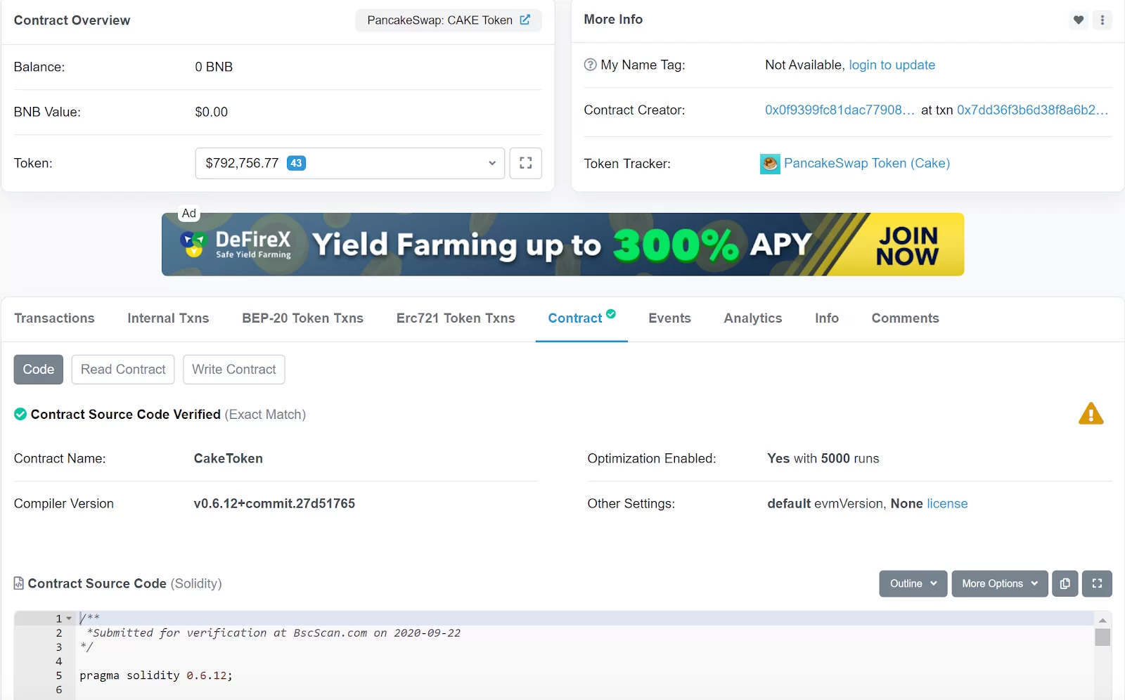 ก่อนอื่นแล้วเราสามารถดูโค้ดที่เป็น Contract ของ DeFi แพลทฟอร์มได้ด้วยการเข้าไปที่ Bscscan หรือ Etherscan แล้วค้นชื่อ Contract นั้นซึ่งถ้าไม่แน่ใจสามารถหา Contract ได้จาก Coinmarketcap หรือ Coingecko (แต่ส่วนมากแล้วแพลทฟอร์มเปิดใหม่จะยังไม่ลิสขึ้นแพลทฟอร์มเหล่านี้อาจจะต้องค้นเอาจากใน Doc หรือตัว Contract โดยตรง)