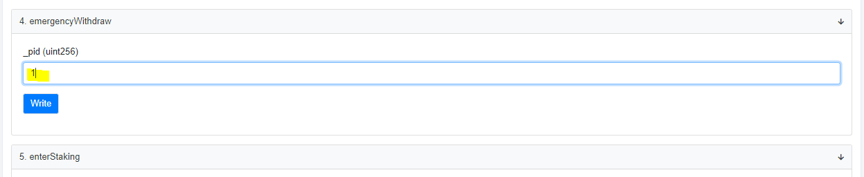- ไปที่ Write ในหน้า Contract เดียวกันมองหากด Connect web 3.0 ด้วย Metamask แล้วมองหา Functtion ที่ชื่อว่า emergencyWithdraw ใส่เลข pool id ลงไปจากตัวอย่างคือ 1 แล้วกด Write