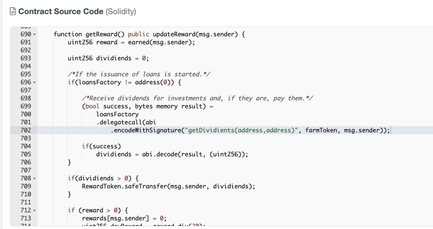 - ตรวจสอบ DELEGATECALL ฟังชั่น `delegatecall()` เป็นฟังชั่นที่จะทำการเรียกฟังชั่นจาก Contract อื่นอีกทีซึ่ง Contract นั้นอาจจะเป็น Contract ของคนอื่น ซึ่งอาจทำให้การทำงานของ Contract เดิมเปลี่ยนไป ตัวอย่างเช่น Multi.financial ที่ทำการ Rugpull ไป (Rugpull หมายถึงการดึงพรมหรือหมายถึงการขโมยเงิน)