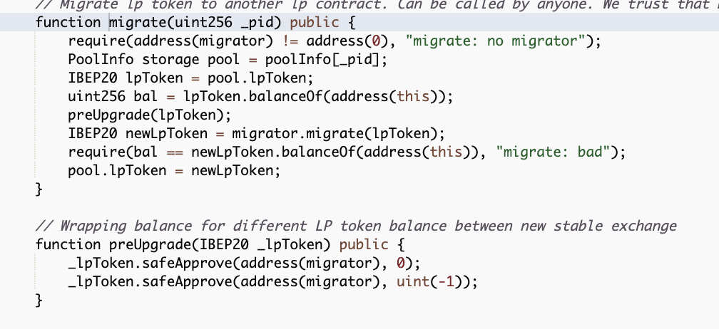 - Migrate Function ฟังชั่นนี้เป็นฟังชั่นที่ต้องระวังมากเพราะมันเป็นฟังชั่นที่สามารถทำให้เงินของคุณถูกโอนไปที่อื่นได้ เช่น https://bscscan.com/address/0x584527ded17aceb3dc617c40b04e8fe9afc57096#code