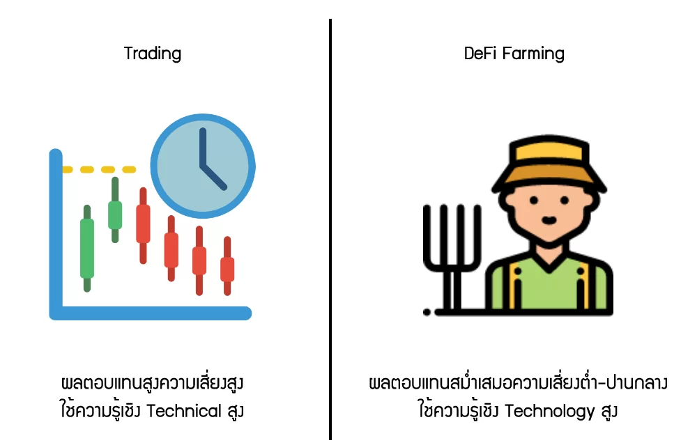 การลงทุนใน DeFi นั้นไม่ใช่การที่คุณเอาเงินไปซื้อเหรียญอะไรเหรียญหนึ่งแล้วรอโอกาสทำกำไรตอนที่เหรียญมันขึ้น แต่มันจะคล้ายกับการที่คุณเอาเงินไปวางแล้วได้ดอกเบี้ย เช่น การที่คุณปล่อยกู้เงินใน Compound คุณก็จะได้ค่าธรรมเนียมจากการที่มีคนกู้เงินนั้นไป ถ้าคุณนำเงินไปวางเป็นคู่เทรดใน Uniswap คุณก็จะได้ผลตอบแทนตามสัดส่วน เมื่อมีคนแลกเปลี่ยนเหรียญในคู่เทรดที่คุณวางไว้ จากค่าธรรมเนียมที่เกิดขึ้นในระบบให้แก่คุณ ซึ่งรายได้ของคุณนั้นก็จะไม่คงที่เพราะมันจะแปรผันไปตามการใช้งานที่เกิดขึ้นจริงแต่ก็แน่นอนว่าเมื่อคิดเฉลี่ยต่อปีแล้วมันสูงกว่าการฝากเงินธนาคารมาก (แล้วเราจะฝากเงินธนาคารไปทำไม?)