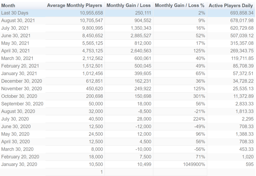 ในปัจจุบัน Axie Infinity มีการซื้อ-ขายตัว Axie เฉลี่ยวันละ 60,000 ตัวโดยมีปริมาณซื้อขายวันละ $27 ล้าน โดยมี Daily active user ประมาณ 3-6 แสนคนต่อวัน (dota2 อยู่ที่ประมาณ 4-5 แสนคนต่อวัน) โดยเหรียญ AXS ได้เติบโตจากราคา $0.5 มาสู่ปัจจุบันที่ $70 ด้วยมูลค่าการตลาดกว่า $4 พันล้าน