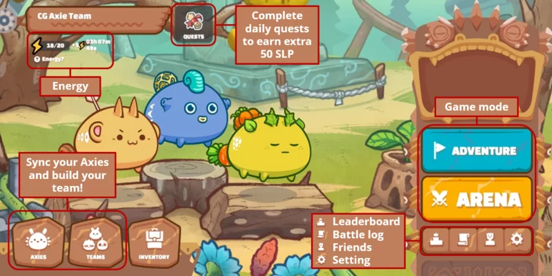 เมื่อคุณมี Axie 3 ตัว จะได้รับ Energy ทั้งหมด 20 Energy ต่อวัน โดยจะรีเซ็ตตอน 7 โมงเช้า เมื่อเราเล่น PVP หรือ PVE จะเสีย Energy 1 หน่วย ในกรณีที่เรามี Energy แล้วผ่านด่าน PVE จะทำให้ได้รับ EXP ที่สามารถนำมาอัพเลเวลน้อง Axie ให้เก่งขึ้นแต่ระบบเลเวลจะมีผลแค่ตอนเล่น PVE เท่านั้น (ในโหมด PVP ทุกตัวจะเลเวล 1 เท่ากันหมด) ถ้านำ Energy ไปเล่นในโหมด PVP แล้วชนะจะได้รางวัลเป็นเหรียญ SLP(Smooth love Potion)