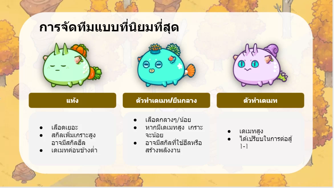 การเล่นเกม Axie มีความหลากหลายเนื่องจากแต่ละตัวจะมีค่า Stat และความสามารถที่ไม่เหมือนกันพูดง่ายๆก็คือ Axie แต่ละตัวเป็น NFT ที่ไม่มีตัวไหนเหมือนกันเลย โดยทั่วไปแล้วทีมพื้นฐานจะแบ่งออกเป็น Tank Support Damage เหมือนเกมทั่วไป แต่เราก็สามารถพลิกแพลงได้มากกว่านั้น เช่นบางครั้งเราอาจจะจัดทีมแบบพิเศษที่อาจจะชนะทางทีมรูปแบบนึง (ที่อาจจะมีคนเล่นเยอะ) ก็เป็นไปได้