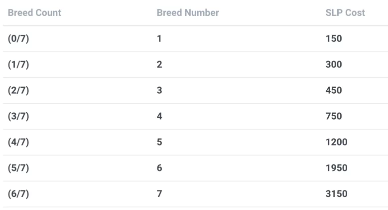 การจะสร้าง Axie ใหม่ 1 ตัวต้องอาศัย Axie 2 ตัวมาผสมพันธุ์กัน (Breed) โดย Axie 1 ตัวจะสามารถผสมพันธุ์ได้ทั้งหมด 7 ครั้ง และทุกครั้งที่ผสมจะจำเป็นต้องใช้ SLP เพิ่มมากขึ้น ยกตัวอย่างเช่น ถ้า Axie ของเราไม่เคยผสมพันธุ์มาก่อนก็จะมี Breed count เป็น 0/7 และจะใช้ SLP ในการผสมครั้งแรกเพียง 150 ขวด/ตัว และจะเพิ่มขึ้นเรื่อยๆ ตามตารางด้านล่าง