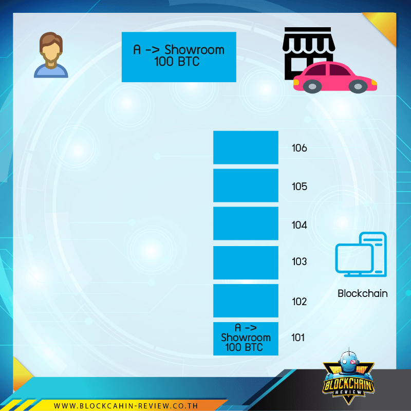 สมมติว่าผมกำลังเดินไปที่โชว์รูมรถเพื่อเลือกดูรถ และในที่สุดผมก็ได้ตัดสินใจเลือกรถสปอร์ทสุดเท่ห์มาหนึ่งคันและตัดสินใจจะจ่ายเงินแก่เจ้าของโชว์รูมด้วย bitcoin และเจ้าของโชว์รูมก็รับ bitcoin ในการซื้อขายรถเช่นกัน ผมจึงโอน bitcoin ให้กับเจ้าของโชว์รูมรถไปเป็นจำนวน 100 BTC และแน่นอนว่าเจ้าของโชว์รูมก็มีความรู้พอว่าเขาควรจะต้องรอ Block Confirmation ถึง 6 Confirm ด้วยกัน เขาจึงเปิด Blockexplorer ของ Bitcoin เขาพบว่าธุรกรรมที่โอน bitcoin จำนวน 100 BTC นั้นอยู่ใน Block ที่ 101 เขาจึงรอให้ Block นั้นต่อไปถึง Block ที่ 106 ซึ่งเท่ากับว่าตอนนี้ธุรกรรมที่ซื้อรถสปอร์ทนั้นมี 6 Confirmation แล้ว เจ้าของโชว์รูทจึงมั่นใจว่าเขาได้รับเงินแล้ว และจึงมอบกุญแจรถสปอร์ทให้แก่ผม