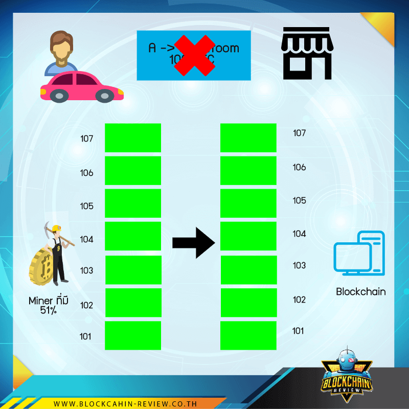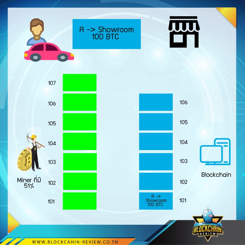 ย้อนกลับมาที่โชว์รูมพอผมได้กุญแจรถสปอร์ท ในขณะที่ข้อมูล Blockchain ที่เจ้าของโชว์รูมดูอยู่นั้นอยู่ที่ Block ที่ 106 ผมได้ทำการขุดไปจนถึง Block ที่ 107 โดยใน Blockchain ของผมนั้นไม่มีข้อมูลธุรกรรมที่ผมจ่ายเงินให้แก่เจ้าของโชว์รูมมาก่อน ทันทีที่ผมขึ้นรถและขับรถออกจากโชว์รูมผมก็ได้ทำการ Broadcast Blockchain ของผมไปทั่วทั้งระบบ ผลที่เกิดขึ้นก็คือ Blockchain ของผมนั้นยาวที่สุด Node อื่นๆจึงเชื่อว่า Blockchain ของผมนั้นเป็นจริงและนำ Blockchain ที่ไม่มีธุรกรรมในการซื้อรถสปอร์ทเขียนทับลงไป ทำให้ผมได้ทั้งรถสปอร์ทและยังมีเงินอยู่ 100 BTC เหมือนเดิม
