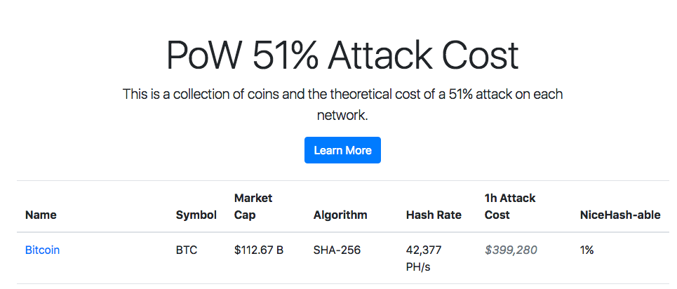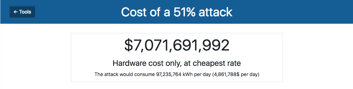 การที่ใครคนใดคนหนึ่งคิดจะทำ 51% Attack ในระบบหนึ่งแปลว่าเขาจะต้องมีต้นทุนมหาศาล ในปัจจุบัน (อ้างอิงจากเวปไซต์ https://gobitcoin.io/tools/cost-51-attack/ )เราจะต้องใช้เงินประมาณ 7 พันล้านดอลลาร์หรือประมาณ 230 พันล้านบาทในการซื้อเครื่องขุด และเสียค่าไฟในการขุดอีกเป็นเวลาต่ำที่สุด 1 ชั่วโมงคิดเป็นเงิน 4 แสนดอลลาร์ (อ้างอิงจาก https://www.crypto51.app/) 13 ล้านบาท ซึ่งต้นทุนขั้นต่ำทั้งหมดคือ 231 พันล้านบาท